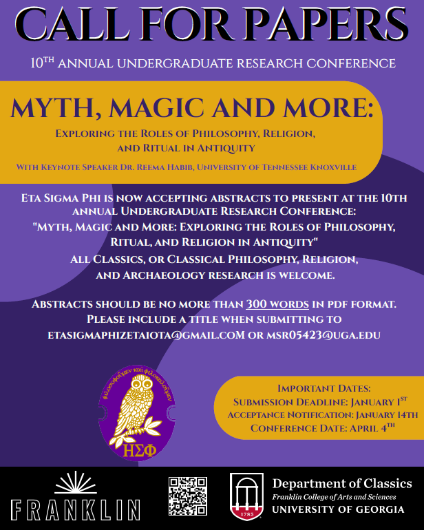 Eta Sigma Phi is the national honorary collegiate society for students of Latin and/or Greek. Members are elected by local chapters which have been chartered by the national Society. The purposes of the Society, in the words of its Constitution, are "to develop and promote interest in classical study among the students of colleges and universities; to promote closer fraternal relationship among students who are interested in classical study, including inter-campus relationship; to engage generally in an effort to stimulate interest in classical study, and in the history, art, and literature of ancient Greece and Rome." The UGA chapter of Eta Sigma Phi welcomes all students of Classical languages in good academic standing to be a part of our honor society. We are involved in Classical activities and lectures on campus, and we promote fellowship between Classics students and their professors. Our chapter also strives to have a positive impact on our community through a variety of service activities. Membership: Membership is limited to students who have completed at least 2 courses in Latin or Greek and have maintained a B average in these ancient language courses. New members have a choice between a one-time $40.00 initiation fee for active membership in the national organization (including a certificate and a subscription to Nuntius) or a $10.00 local membership fee without any of the national benefits. Graduate students are welcome to inquire about associate membership. Please pay your dues to our treasurer at one of our meetings or seal your dues in a clearly labeled envelope and give it to one of the other officers. ETA Sigma Phi News Eta Sigma Phi has had a fantastic start to the 2024-2025 school year with a new record of 22 total Eta Sigma Phi members making us one of the largest chapters in the country! Eta Sigma Phi also gave a nod to the ancient past with our yearly Eleusinian Mysteries event in which we emulate the initiation rites of the cult of Demeter and Persephone. In the future, we are looking forward to hosting aClassics Trivia Night and our very first semi formal for members! Please look forward to what events we have in mind for the future. National Eta Sigma Phi Website 2025-2026 Officers:President: Madeleine RosenbergVice President: Mattea BrownSecretary: Sarah EllingtonTreasurer: Ella ThomasFaculty Advisor: Dr. Benjamin WolkowContact Us:Email: etasigmaphizetaiota@gmail.comTwitter: UGAetasigmaphiInstagram: @etasigmaphiuga Tenth Annual Undergraduate Research Conference Spring 2026. Eta Sigma Phi will be hosting the 10th Annual Undergraduate Research Conference: "Myth, Magic and More: Exploring the Roles of Philosophy, Religion, and Ritual in Antiquity", April 4th, 2026. We are currently accepting abstracts submissions. Any Classics, Classical Philosophy, Religion, and Archaeology related research is accepted. If selected, they will be given the opportunity to present their research at the conference. Please see posters. Abstracts are due Friday, January 1st, 2026. Abstract acceptance letters will be sent by January 14th. Submissions may be emailed to etasigmaphizetaiota@gmail.com in PDF format, with the title included. Please direct any questions to etasigmaphizetaiota@gmail.com. ETA SIGMA PHI LEADERSHIP Are you looking for an opportunity to expand your leadership abilities? Eta Sigma Phi leadership applications for 2026-2027 academic year will be available in the Spring. Please direct any questions to etasigmaphizetaiota@gmail.com